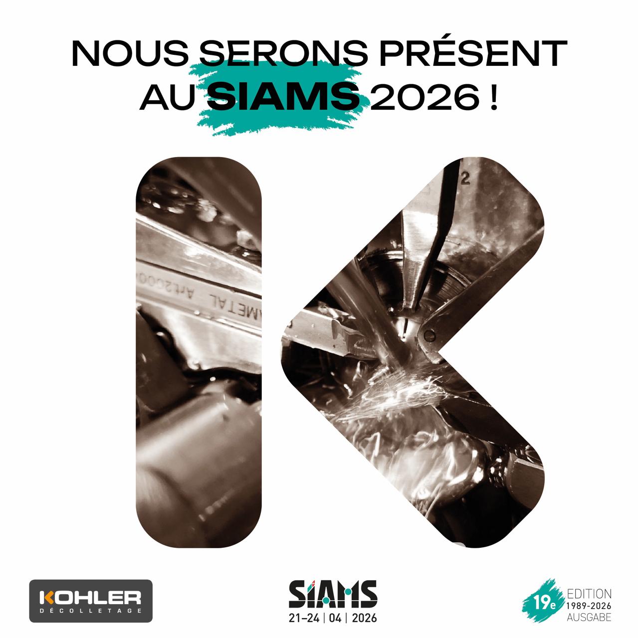 Kohler Décolletage sera présent au SIAMS 2026 du 21 au 24 avril 2026 à Moutier.